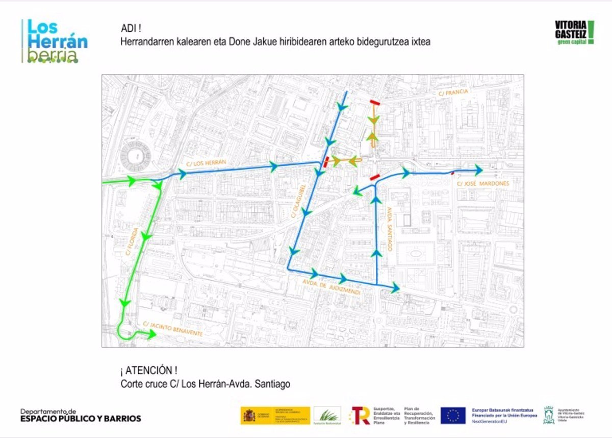 Por otro lado, los itinerarios provisionales se realizarán en sentido norte, desde Los Herrán a Santiago (a la contra) y de ahí a José Mardones (a la contra) hasta la incorporación al nuevo vial a la altura de la calle Logroño. Por sentido sur, la circulación va de la calle José Mardones a Logroño, Avenida Judimendi, Santiago y José Mardones.